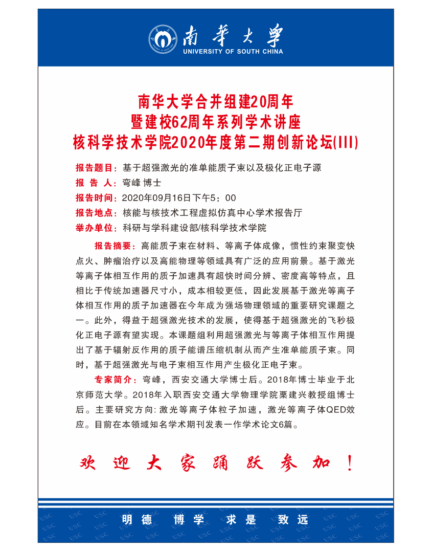 MK平台合并组建20周年暨建校62周年系列学术讲座--基于超强激光的准单能质子束以及化正电子源