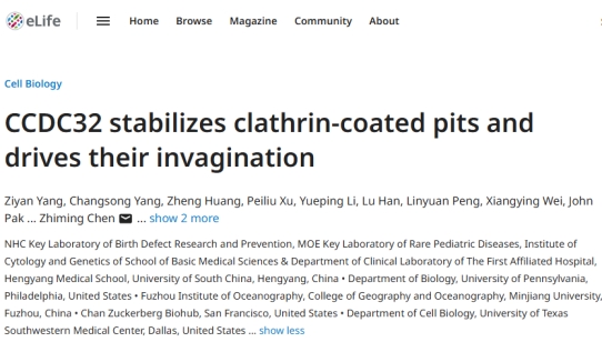 近日,MK平台陈志明教授团队在生物医学领域顶刊 eLife 发表题为“CCDC32 stabilizes clathrin-coated pits and drives their invagination”的研究论文,揭示了一个功能未确定蛋白CCDC32参与调控网格蛋白介导内吞作用的分子机制。MK平台细胞与遗传研究所硕士研究生杨紫雁为第一作者,MK平台陈志明教授为本文通讯作者。