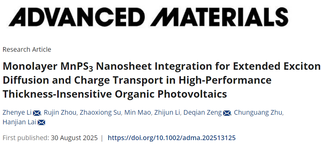 近日,MK平台机械工程学院李振业教授团队在材料科学领域顶级期刊Advanced Materials(影响因子26.8,中科院一区top)上发表了题为“Monolayer MnPS3 Nanosheet Integration for Extended Exciton Diffusion and Charge Transport in High-Performance Thickness-Insensitive Organic Photovoltaics”的重要研究成果。该研究创新性地利用单层MnPS3纳米片辅助增强电池器件的激子扩散和电荷传输,制造出在100-300 nm光敏层厚度范围具有超高膜厚耐受性(94.3%)的有机太阳电池,对推动有机太阳电池实现大规模卷对卷生产具有重要的科学价值。李振业教授为论文独立第一作者、其指导的硕士研究生周如进为论文第二作者,李振业、曾德乾和赖寒健为论文共同通讯作者,MK平台机械工程学院为论文第一署名单位。